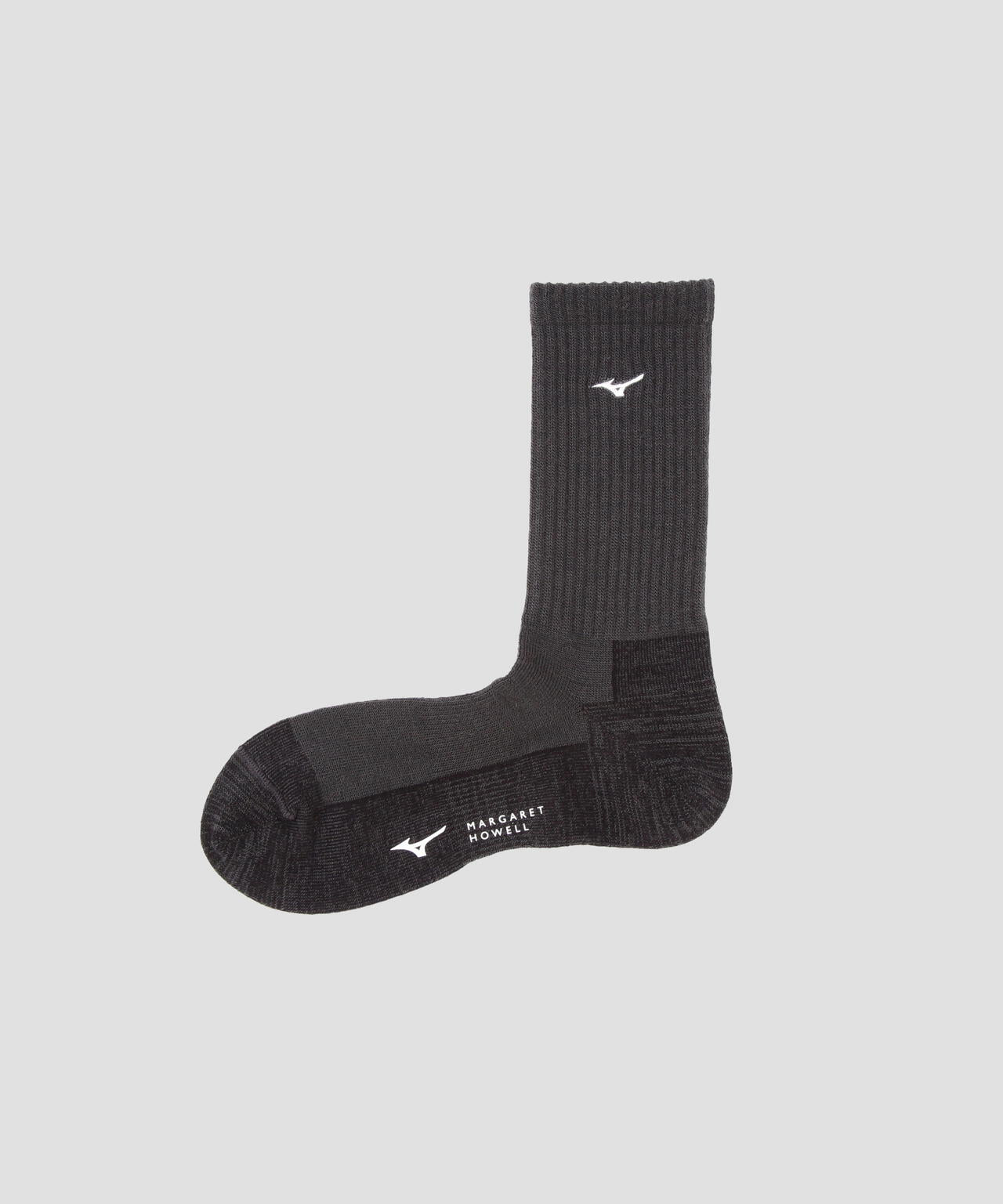 ミズノの高い技術力とマーガレット・ハウエルの感性を融合させたコレクション「MIZUNO FOR MARGARET HOWELL」。フット部分に吸湿発熱素材のブレスサーモ糸を使用。足裏の汗を吸収して発熱し、靴の中で生じる汗冷えを軽減。消臭性にも優れた機能的な仕上がりが魅力。