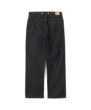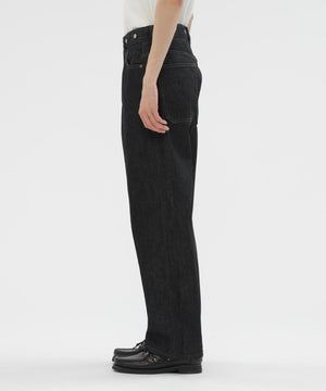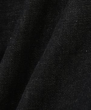 EDWIN FOR MARGARET HOWELLのデニムトラウザーズ。オーガニックコットンを使用したブラックデニム素材。エドウィンの物作りチームの間でヴィンテージと呼ばれる、昔ながらの力織機で織り上げた生地は、立体的な綾目とふくらみ、しっかりとしたコシのある風合いが特長。新しい織機では再現できない、奥行きのある表情に仕上げた一本。