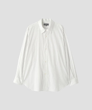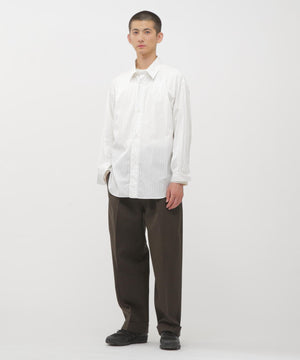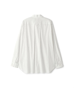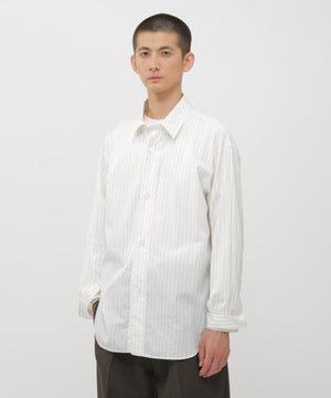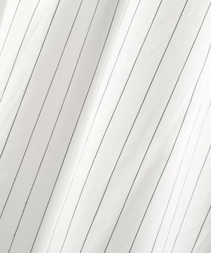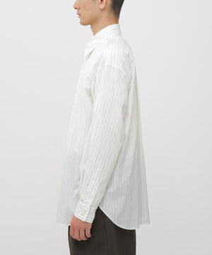 毛羽の少ないコンパクトヤーンを使用した、シルクのような光沢と滑らかな風合いのストライプ素材のシャツ。ホワイトとブラックのピンストライプによるクリーンな表情が特長。