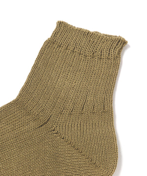 毛羽立ちを抑えた滑らかなコットン糸を使用したショートリブソックス。通気性に優れたゆるめのリブ編みで、軽やかな履き心地が特長。つま先に配したティッピングカラーがポイントのシンプルなデザイン。