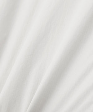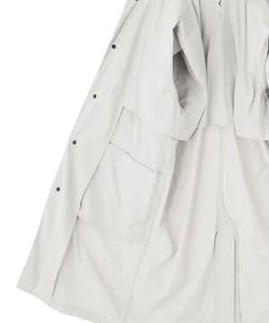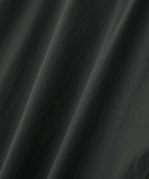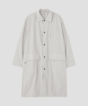 45デニールのリサイクルナイロンにタスラン加工を施した、リップストップ素材を用いたコート。マットな質感にナチュラルな落ち感がある素材で、裏面のアクリルコーティングによって防風性を備えた仕上がり。ベンチコートの要素を取り入れたステンカラーコート。スポーティーな素材ながら、ミニマルなデザインがモダンな印象。