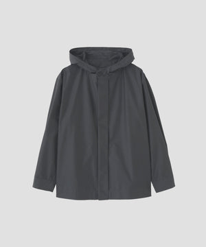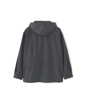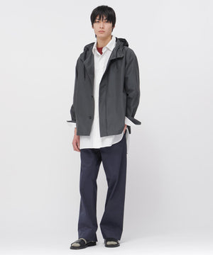 フロントは特殊な比翼仕立てを採用したパーカーデザインで、襟とカフスは剣先のカッティングにホーンボタンを配し、端正な印象。脇線を活かしたシームポケットや、フードに配したレザーストッパー付きドローコードなど、使いやすさを考えたディテールが特徴。