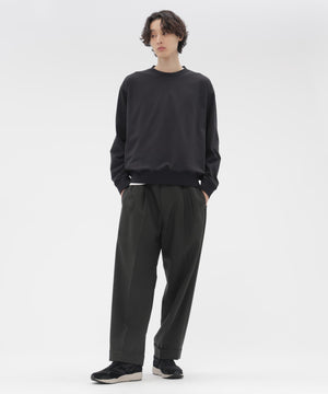 イタリアンウールを用いた、ドライな風合いのトラウザーズ。強撚糸ならではの反発力と、キャンバスのような凹凸を備えた平織素材。柔らかさを残しつつ、肌離れのよい質感が特長。