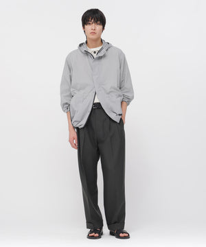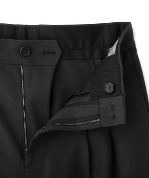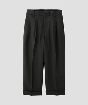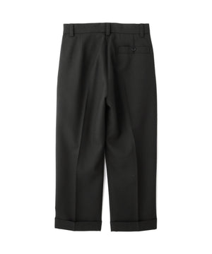 ステッチを効かせたツインプリーツに、アシンメトリックなベルトループを組み合わせたデザイン。裾はダブル仕上げで、シルエットはワイド。 同素材のブルゾンとのセットアップもおすすめ。