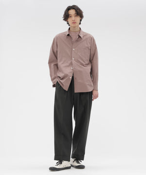 細番手のコットンシャーティング素材を用いた、しなやかなドレープ性を備えるツイルシャツ。なめらかな表面感と軽さをあわせ持つ、落ち着いた印象の素材感。