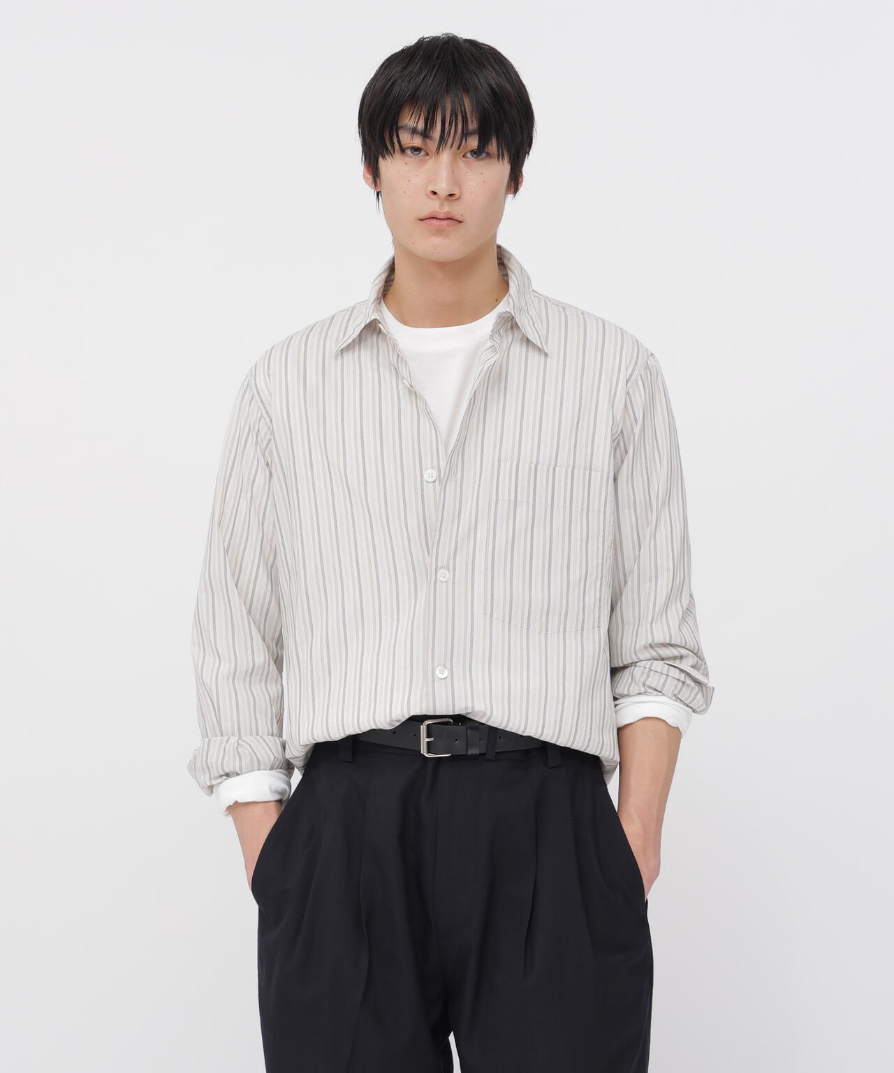 コットンとシルクを組み合わせた、軽やかでさらっとした風合いのストライプシャツ。軽さのある素材で、空気を含んだような着心地が特徴。