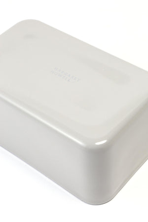 野田琺瑯のバターケース。琺瑯は匂い移りがなく、冷却性が高いのが特徴。また、蓋はバターとも相性のいい桜の木を使用。木蓋はまな板代わりにもなり、そのまま食卓に出すこともできる。