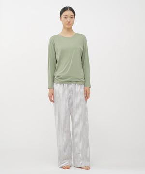 メンズのトランクスをベースにしたデザイン。ストレートラインにゆとりを持たせたシルエットで、パジャマパンツとしてのリラックス感を追求した一本。