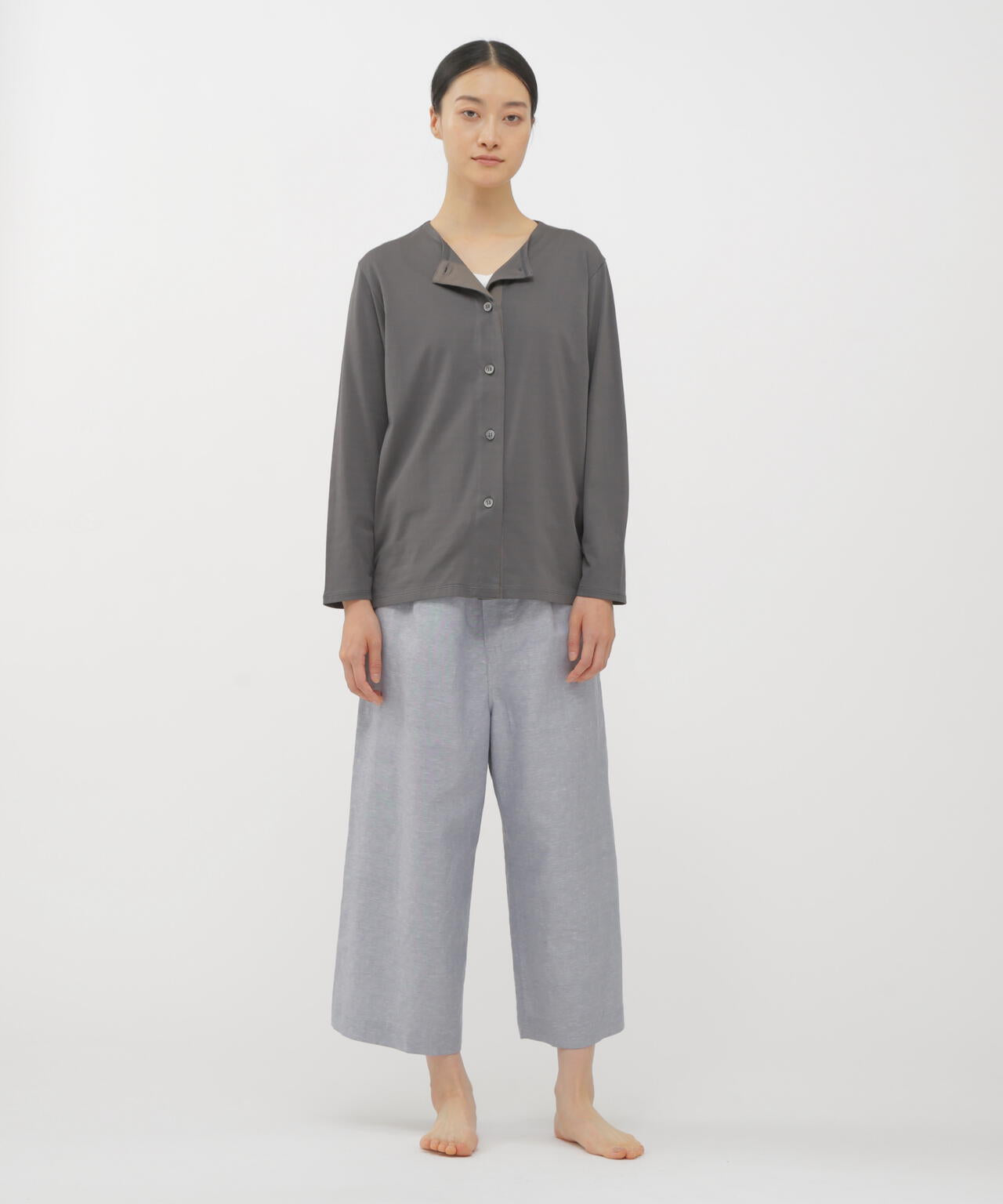 コットンとリネンを組み合わせた、軽やかでボリュームのあるドローストリングトラウザーズ。製品洗いによる柔らかな質感と、肌になじむ自然な風合いが特長。