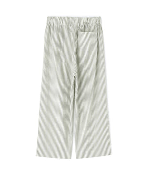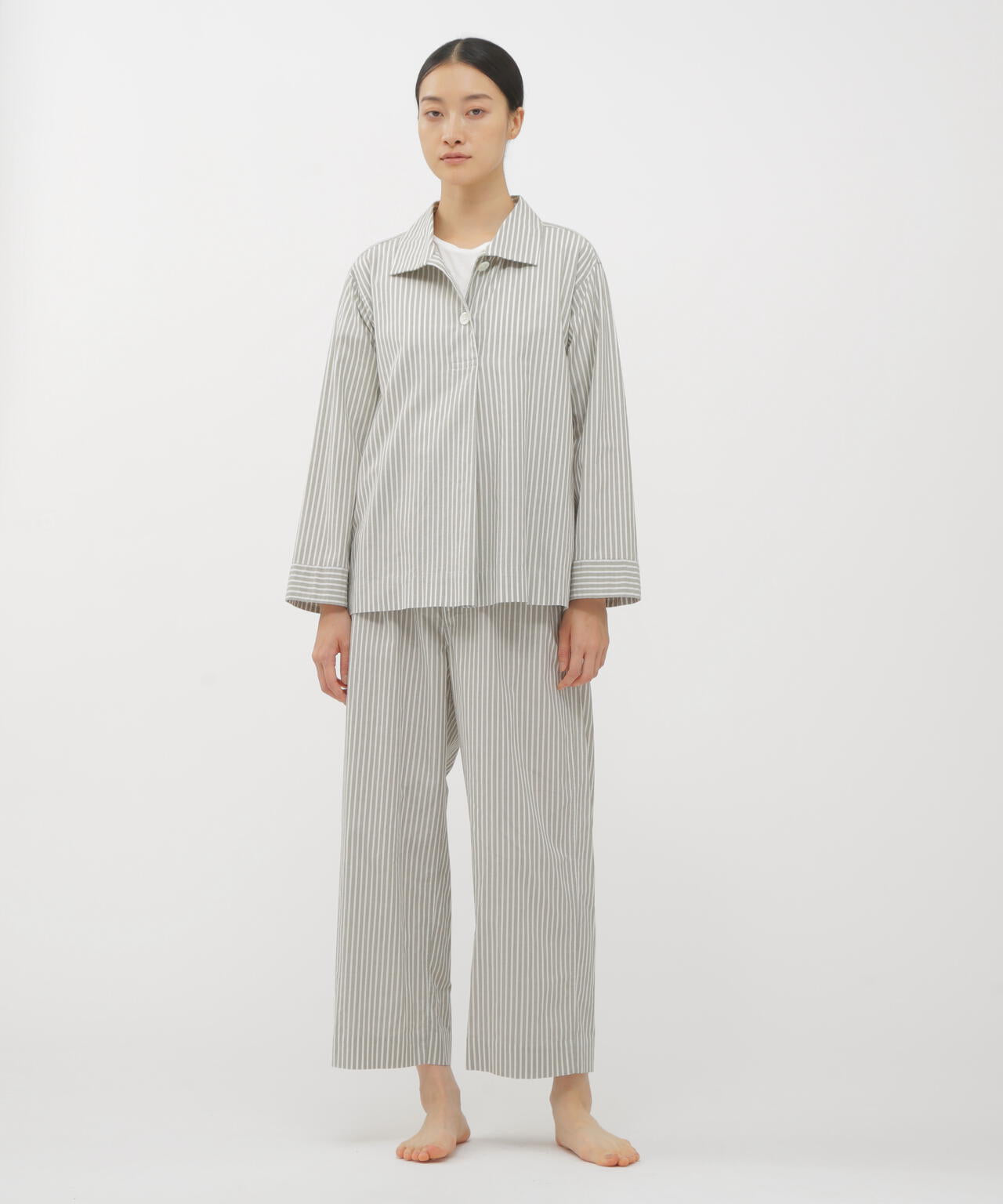 やや太番手のコットン糸を使い、甘めの打ち込みで仕上げたポプリン素材のトラウザーズ。製品洗いによる自然な表情が特徴で、無地とストライプを展開。程よい厚みと軽やかさを備えた素材感。