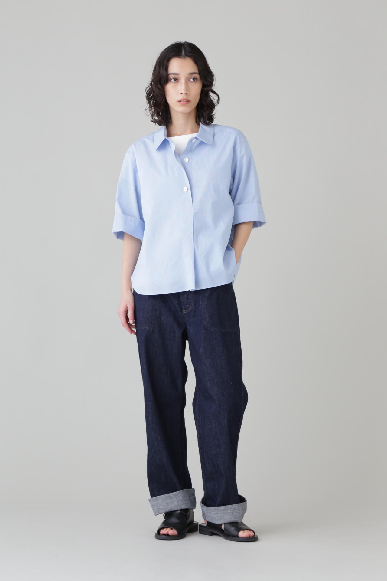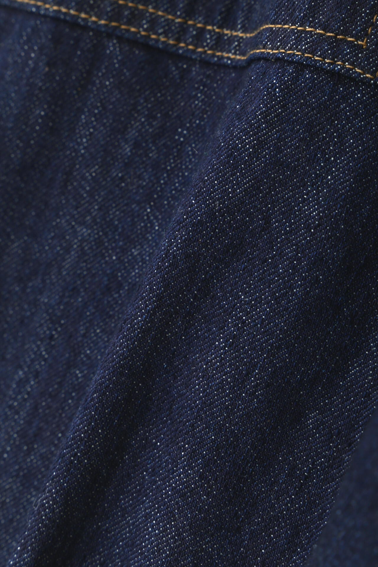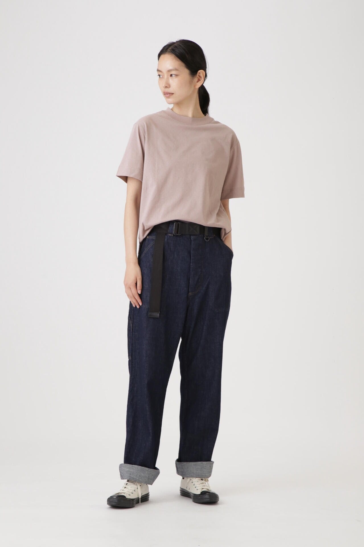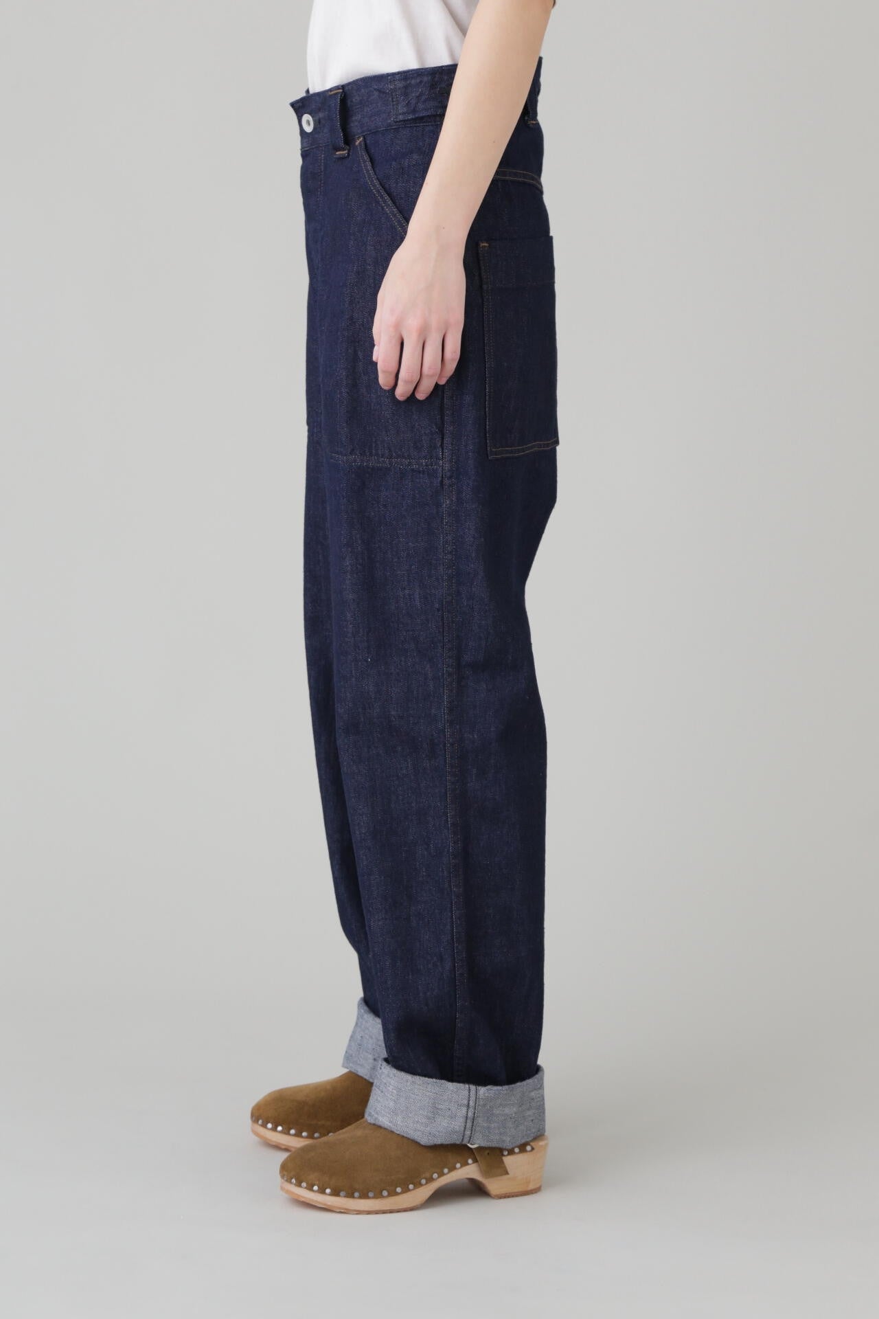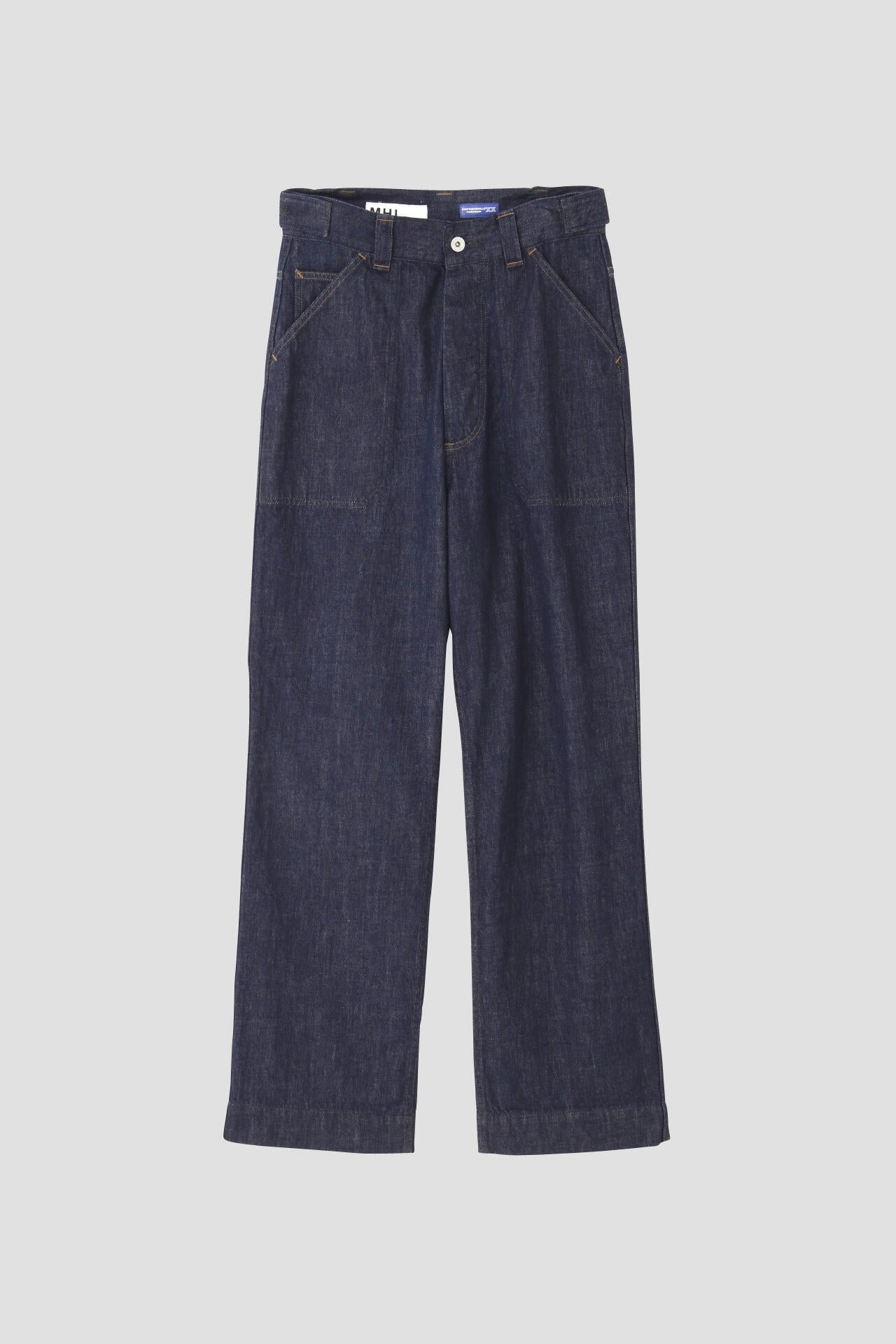薄手ながら膨らみ、コシを持った丈夫なライトオンスデニム。ウェストのタブアジャスターやステッチスルーのポケット仕様など特徴的なディテールを採用。深めの股上設計によるモダンなフィット。