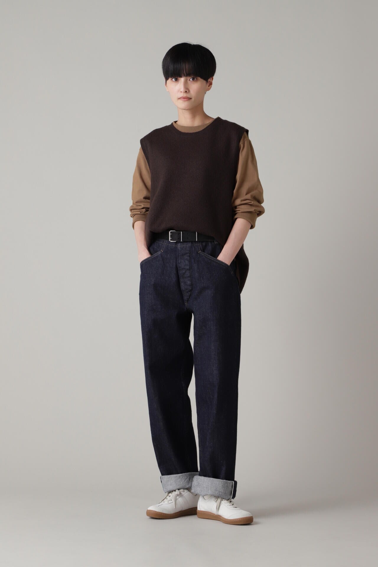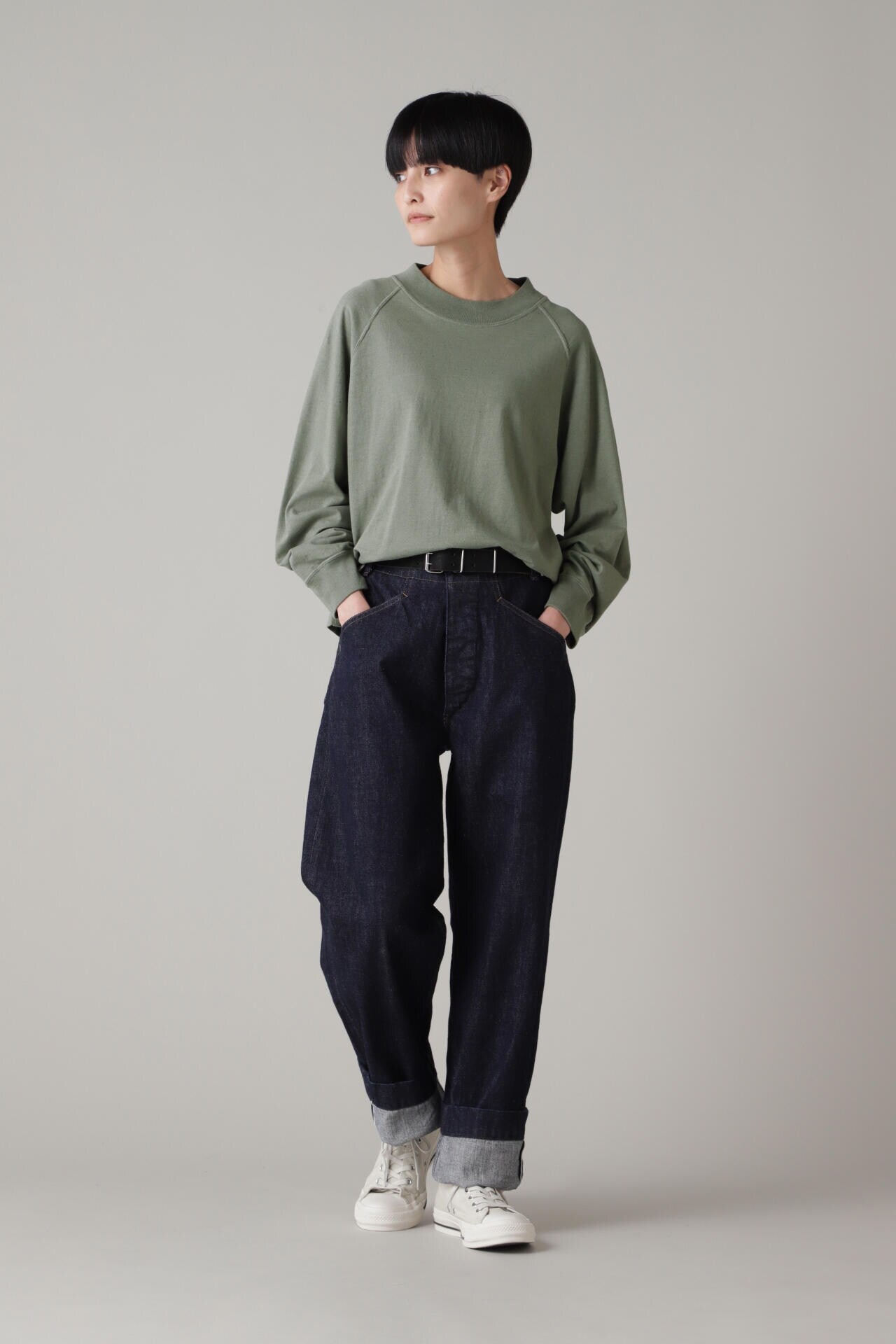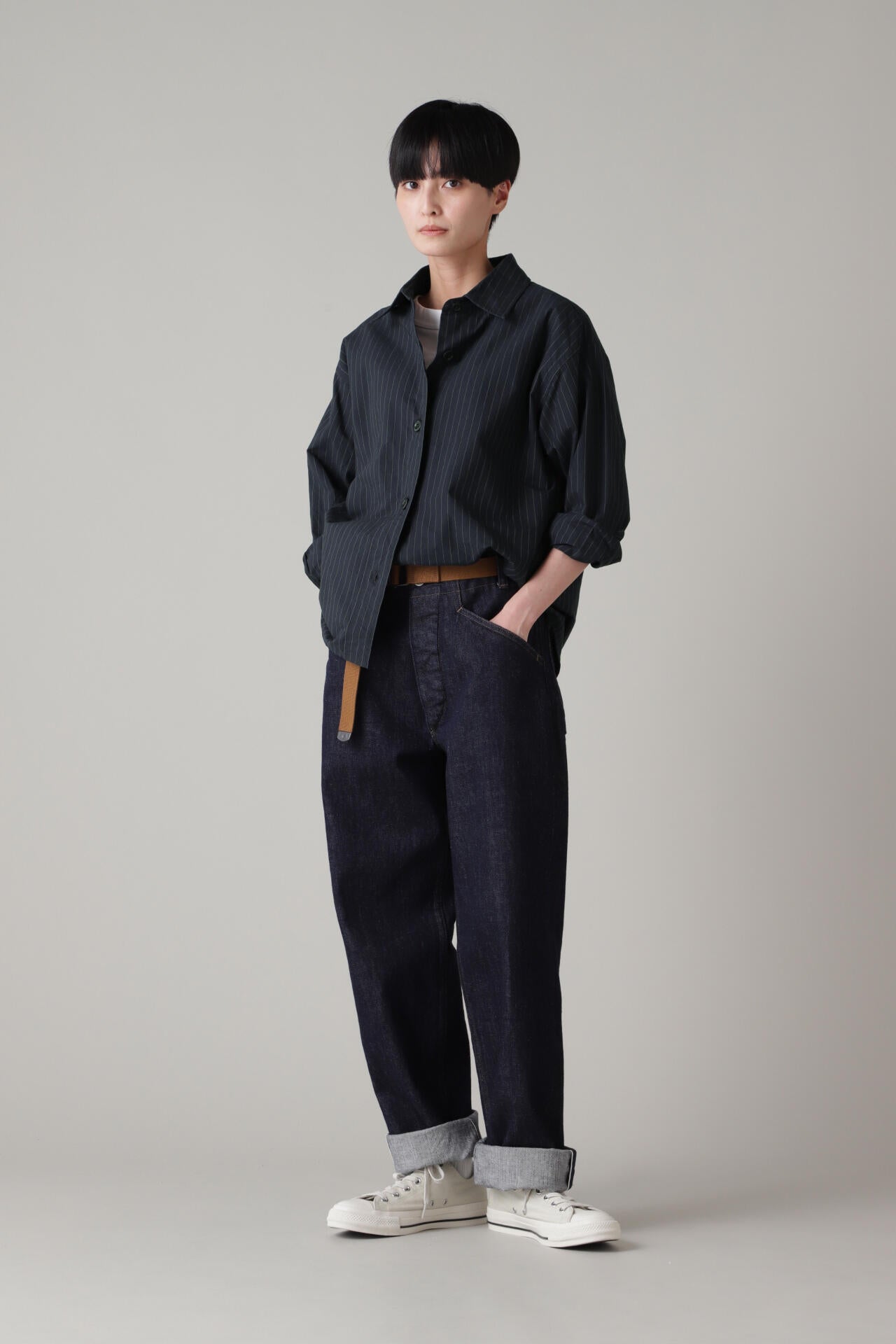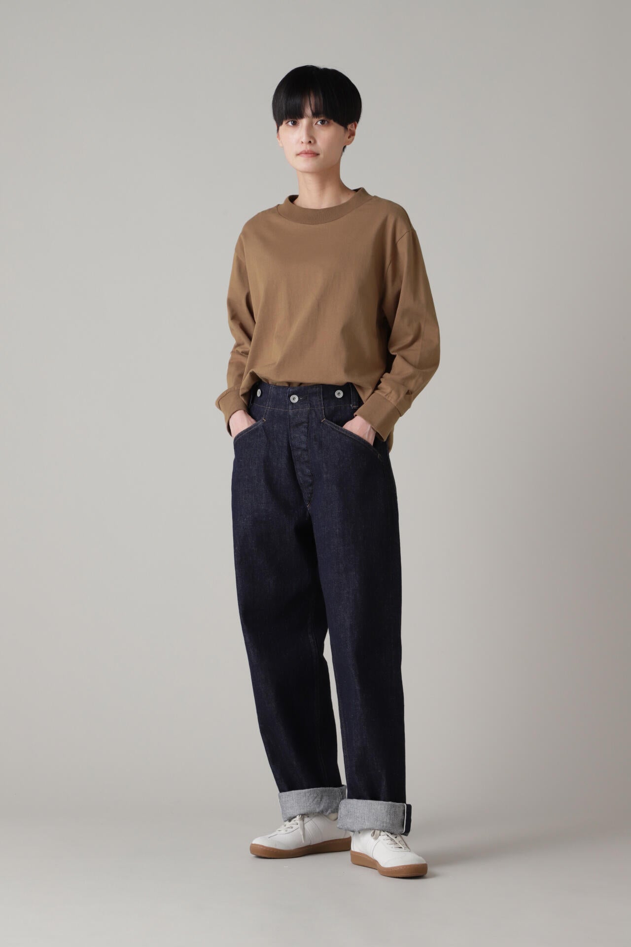 CANTONは 1963年に日本で初めてアメリカ産に引けを取らない本格国産ジーンズとして誕生。MHLでは不均一なネップが特徴のCANTONオリジナルの生地を使用。ネップが相まってワークウエアらしい粗野感のバランスが良く、履き込む程に現れるタテ落ちが特徴。
