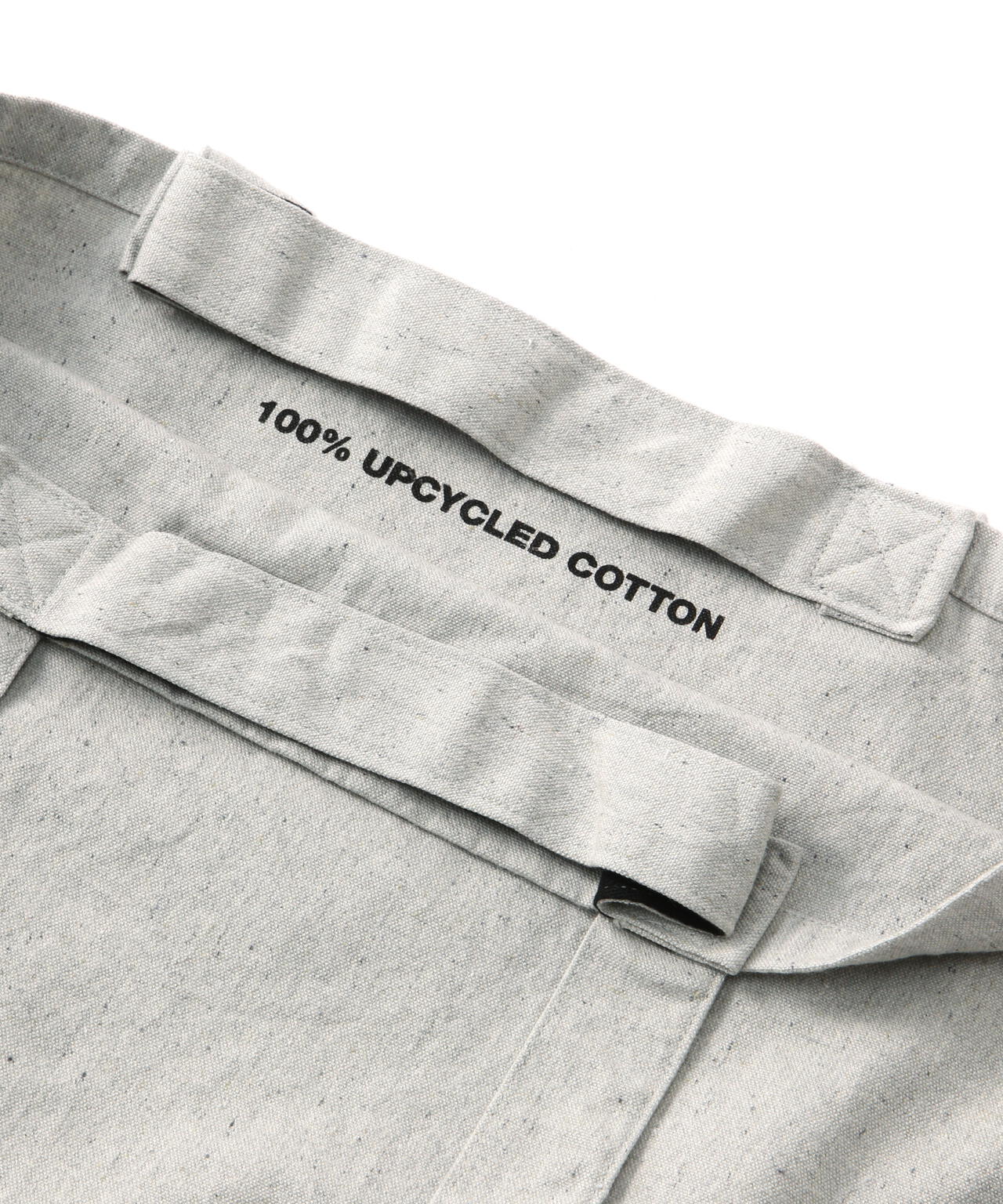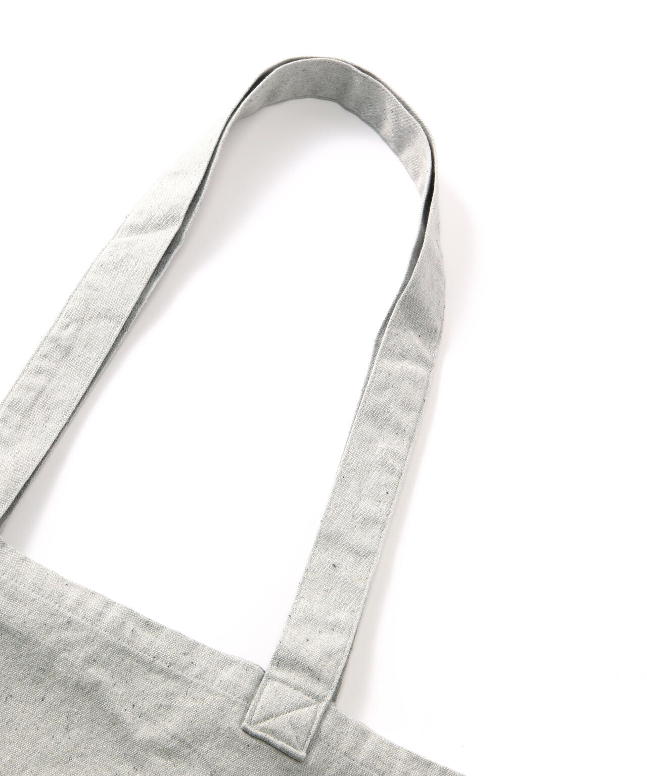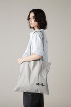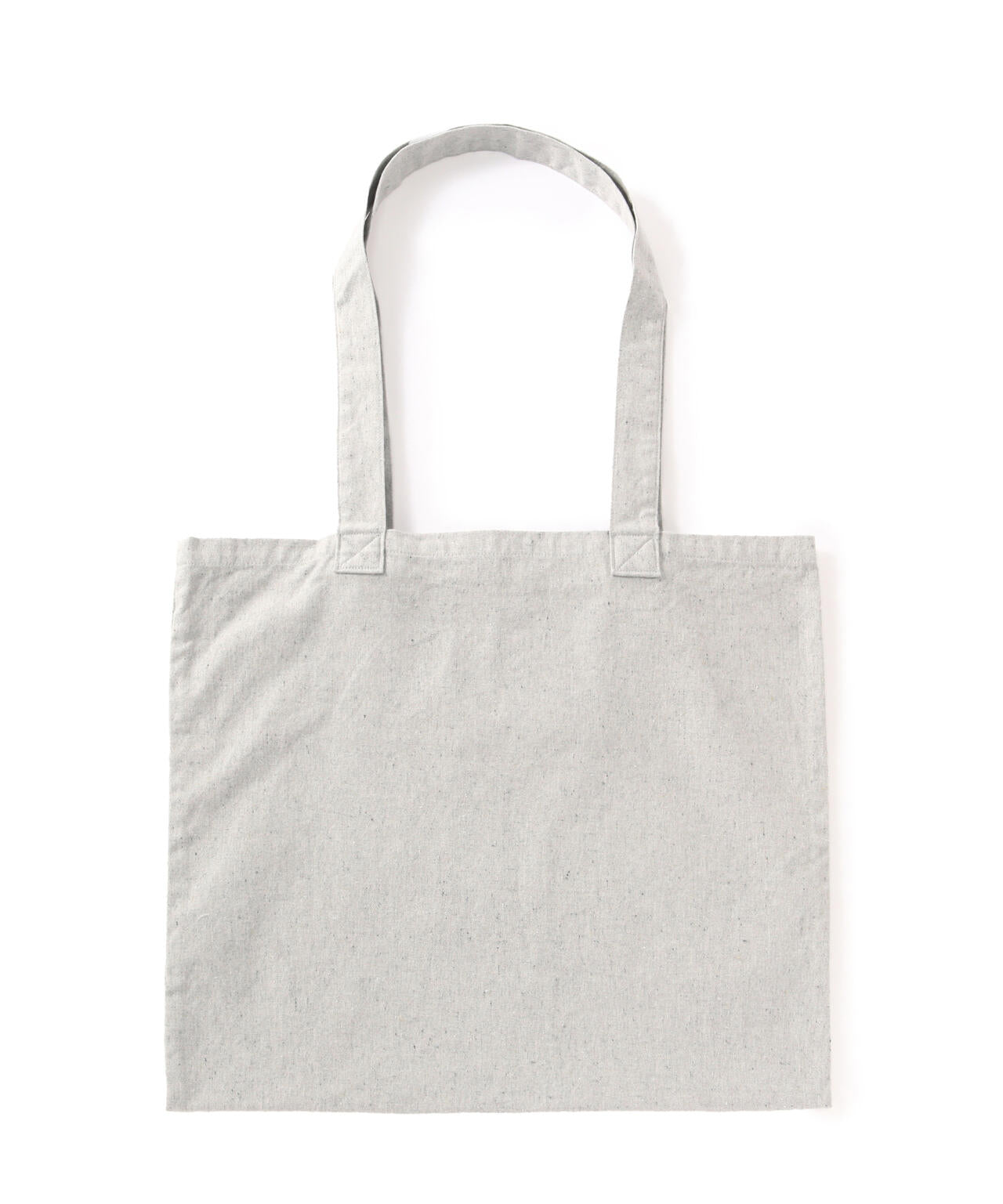 MHL.の製品生産過程で生まれた裁断くずのみを回収し、再利用した完全一環リサイクル素材のバッグ。使いやすいくタフな持ち手は、ショルダー用と短くも持てるように取り付けたヘリンボーンテープの持ち手の2WAY。ヘリンボーンテープの持ち手は、負荷の掛かる部分の当て布の役割も果たしている機能的な仕様。