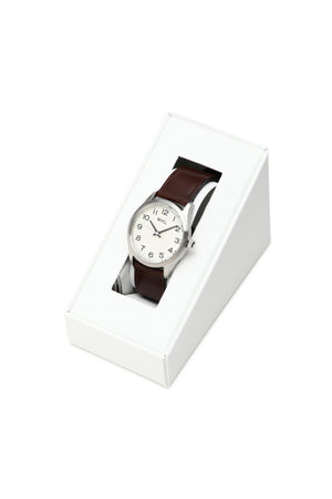 ベジタブルタンニン鞣しの革を用いた時計。ナチュラルな風合いを生かしたストラップは、使い込むほどに型崩れしにくく丈夫になり革が持つ自然な表情を楽しめる。
