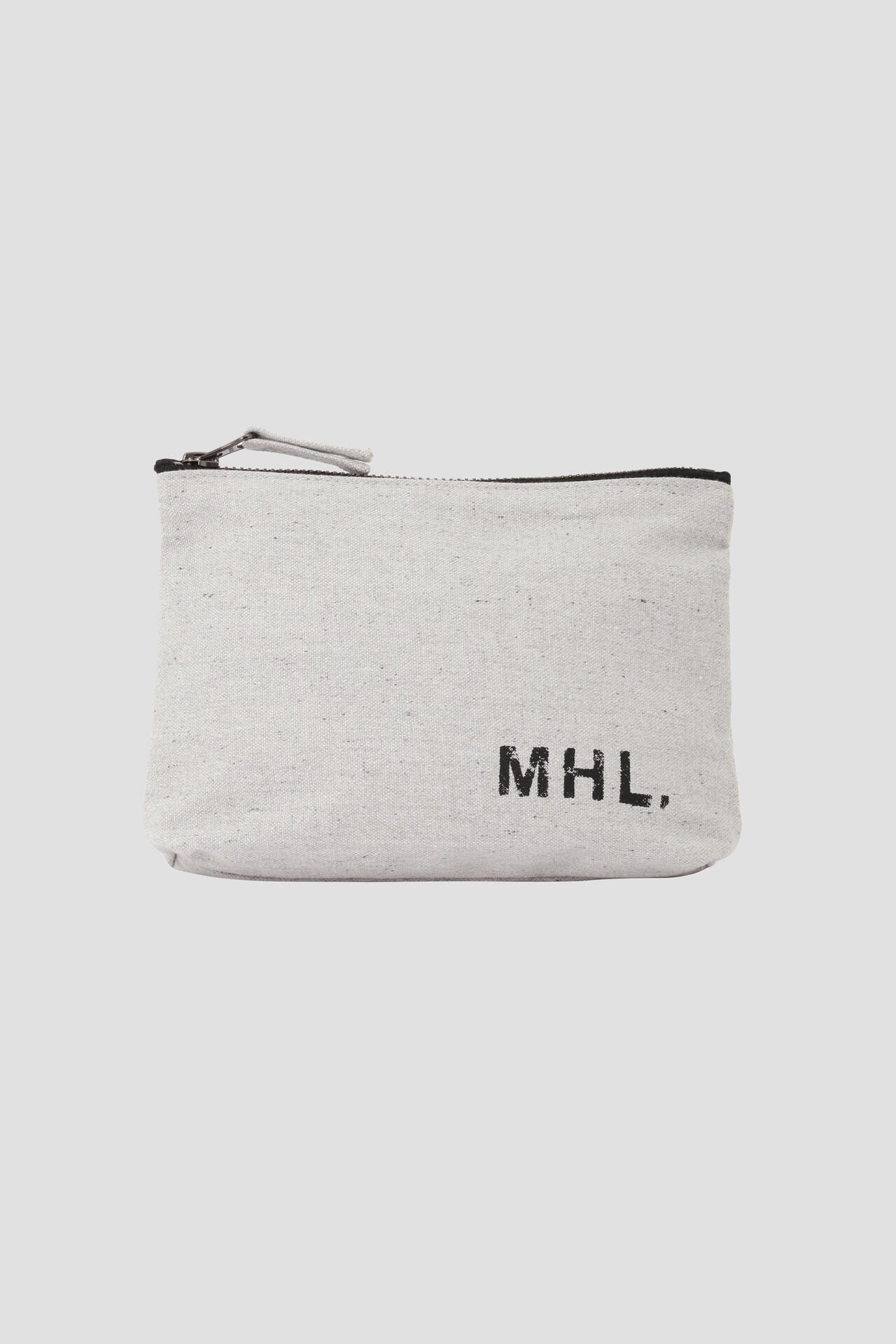 MHL.の製品生産過程で生まれた裁断くずのみを回収し、再利用した完全一環リサイクル素材のポーチ。共布を使用した引手がさり気ないアクセント。