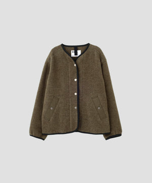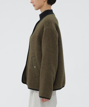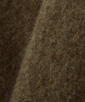 尾州で織り上げたメリノウールを使用したフリース素材のブルゾン。二重織りに両面起毛を施し、肌に触れる部分はすべてウールとなる贅沢な仕立て。スーツ地で用いられる梳毛をあえて取り入れ、柔らかくしなやかな風合いが特長。