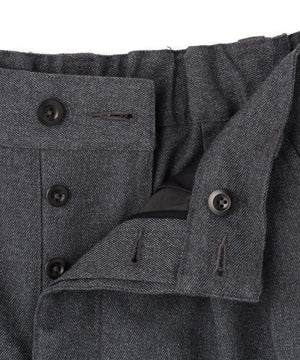 ウールとコットンを組み合わせたドライな質感のトラウザーズ。タテ糸にウールとコットンを掛け合わせ、ヨコ糸には風合いの異なるウールを使うことで、奥行きのある表情と立体感を持たせた素材。綾目の立ったドリル組織で、ほどよくカジュアルな中に上品さを感じる仕上がり。ウールの温かみとコットンのハリを併せ持ち、長い季節で活躍する一本。