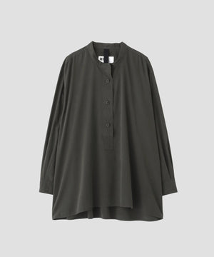スウィングシャツをベースに、着丈や身幅をともに大きくとったオーバーサイズシルエット。身体に自然と馴染むドレープが生まれ、シックな印象を添えるデザイン。ニットとのレイヤードや、ブルゾンを羽織ってもストレスなく着られるので、ロングシーズンで活躍するアイテム。