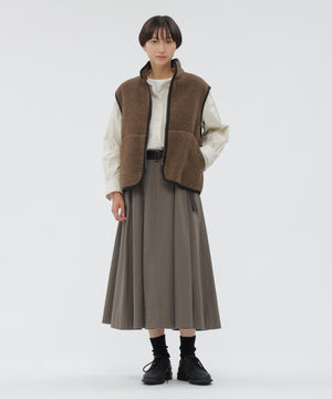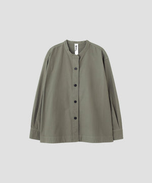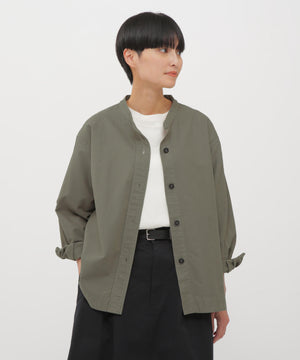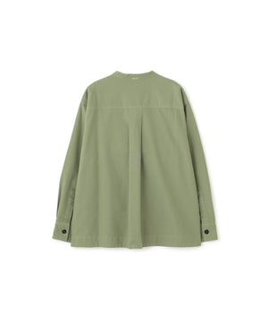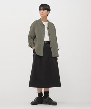太めの前立てやバックプリーツに沿ったステッチを取り入れたシンプルなデザイン。ゆとりのあるAラインシルエットが、スイングシャツのような動きやすさを備えた一枚。