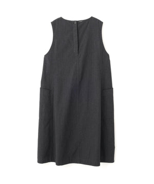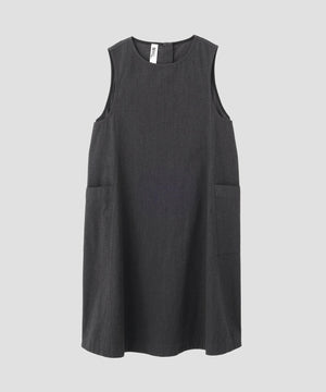 パネル切り替えで構成したドレスは、身幅から裾にかけて広がる分量感と、大きな腰ポケットや後ろのボタンフライがアクセント。ノースリーブに広めのアームホールを組み合わせ、インナーを重ねることで着こなしが楽しめる仕上がり。