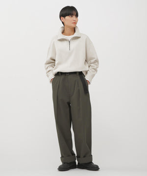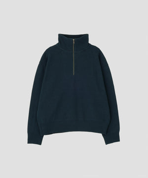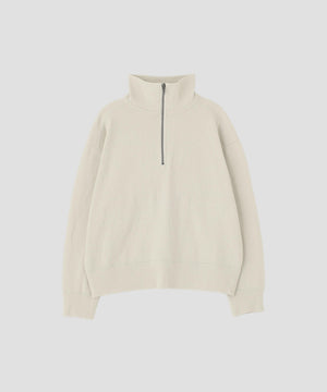ダブルフェイスで編み立てたコットンジャージーで仕立てたハーフジップジャンパー。Tシャツより厚みがあり、裏毛より軽やかな質感が特長。細かなリブのような組織感で、ニットのような着心地を楽しめる素材。
