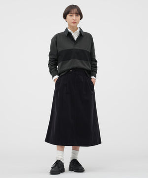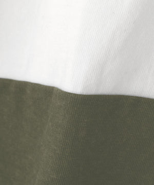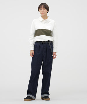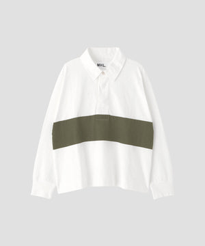 ツイル地の襟と綾テープの前立てなど、クラシックなディテールを取り入れたラガーシャツ。ブロックプリントの素朴な風合いと、ボディと袖を一枚で仕立てた独自のカッティングが、動きやすさと立体的なシルエットを生み出したデザイン。