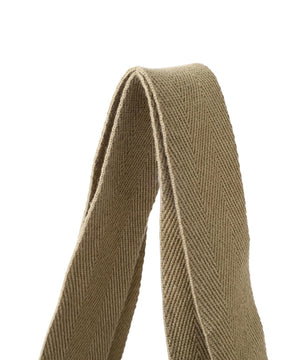 定番のマーケットトートをベースに、PCやA4サイズが収まる程よい大きさで、マチを深くとったユニセックスデザイン。ハンドルは手持ちと肩掛けの2WAY仕様。肩掛け部分にはMHL.のアイコンでもあるヘリンボーンテープを採用し、使わない時は内側に垂らして持てるデザイン。裾の三角マチにはシルバーのリベットを配し、コントラストを効かせたディテールがポイント。