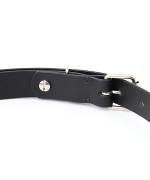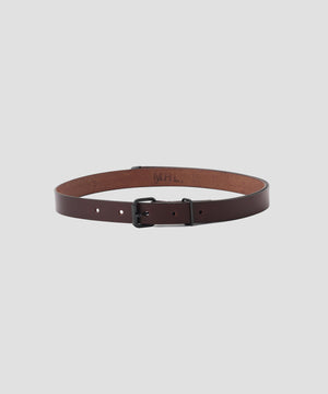 MHL定番のウェビングベルトをレザーで表現したモデル。先端の金具やローラーバックル、リベットを組み合わせ、MHLらしいフォルムを強調。ブラックにはニッケル、ブラウンには黒ニッケルを採用し、それぞれ異なるコントラストを添えたデザインが魅力。