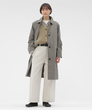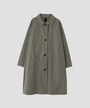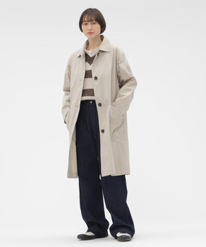 コットンの風合いをいかしつつ、高密度に織り上げた薄手のポプリン素材のコート。織りによる自然な凹凸感が涼しげな表情を生み、シャワープルーフ加工を施すことで、軽さと機能性を備えた仕上がり。
