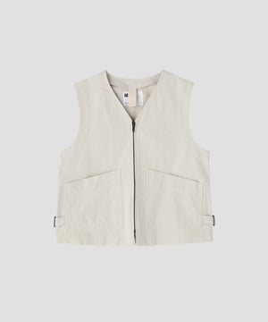 Vネックにフロントジップを合わせ、ウエストのアジャストでシルエットに変化を添えるデザイン。大きな腰ポケットが実用性を加え、MHL.らしいクリーンなバランスに仕上げた一着。同素材のトラウザーズとのセットアップもおすすめ。