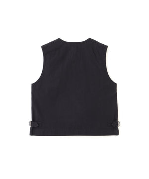 軽さのあるコットンツイルを高密度に織り上げた、MHL.オリジナル素材を用いたウエストコート。インディゴはタテ糸を中白に仕上げることで、加工後に自然なフェードと上品なアタリが生まれる色合い。チョークはわずかにグレーを含んだ深みのあるオフ白で、落ち着いた表情に整えたカラー。一日に約60mほどしか織れない密度のある生地が生む、軽さとタフさを併せ持つ風合い。