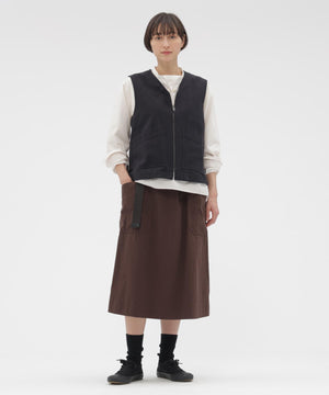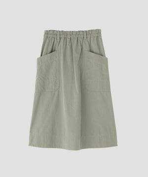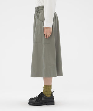 ヴィンテージの巻きスカートを思わせる発想を軸に、大きめのパッチポケットを斜めに置いたデザイン。ウエストはゴム仕様でリラックス感があり、ヘリンボーンテープで調整できるイージーなつくり。