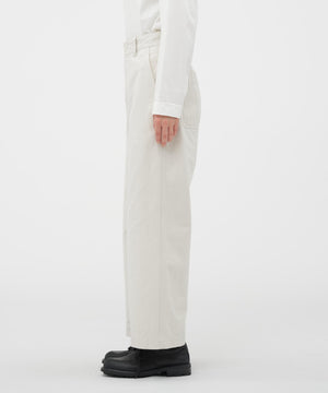 ワークディテールを取り入れつつ、無駄をそぎ落としたシンプルな一本。程よいフィット感のまっすぐなストレートラインが脚をすっきり見せ、タックを入れないクリーンなウエストにサイドアジャストを加えた実用的な仕立て。シルエットのきれいさが際立ち、幅広いスタイルに馴染むデザイン。同素材のウエストコートとのセットアップもおすすめ。