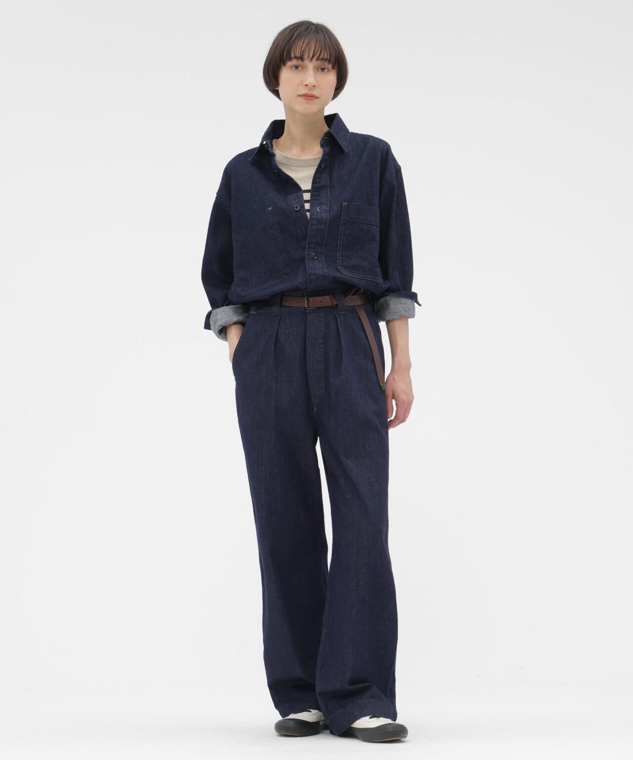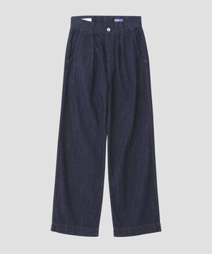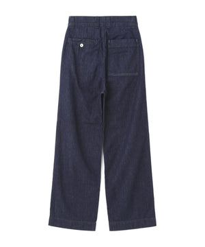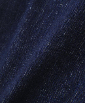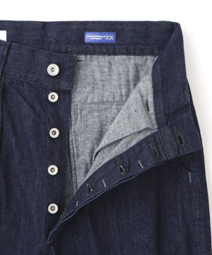 CANTON OVERALLS FOR MHL. のデニムトラウザーズ。旧式の紡績機による不均一なネップ感を再現した、CANTONオリジナルのライトオンスデニム素材(9oz)。履き込むほどに現れるタテ落ちと、さりげないネップが重なり、ワークウエアらしい粗野さとヴィンテージ感をあわせ持つ表情。薄手ながら膨らみとコシを備え、扱いやすく耐久性のある仕上がり。