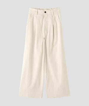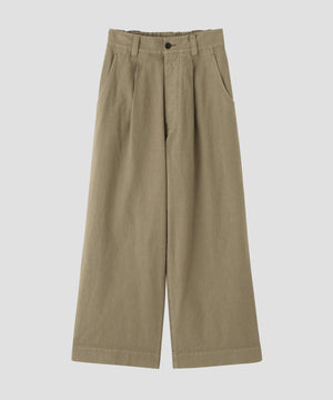 タックを入れた、ワイドシルエットのデザインは、ウエストはゴムギャザー仕様で、リラックスした穿き心地。バックに配した太めのベルトループが、控えめなデザインポイント。シルエットと素材感を素直に楽しめる一本。 同素材のブルゾンとのセットアップもおすすめ。