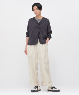 上質なベルギーリネンをベースに、複数のコットンを組み合わせたオリジナル素材のトラウザーズ。日本の老舗紡績メーカーが、長年培ってきた技術と厳選された天然素材を掛け合わせ、時間をかけて丁寧に紡ぎ上げることで、繊維に余計な負荷をかけず、自然なムラ感とさらりとした着心地を実現。 リネンの上品な表情とコットンのやわらかさが調和した、奥行きのある風合いで、洗濯を重ねても毛羽立ちにくく、長く付き合える点も魅力。