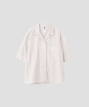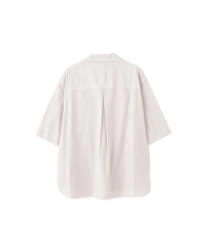サファリシャツから着想を得たボクシーフィットの開襟デザインで、ラウンドした裾ラインやポケット、背面のボックスプリーツなど、さりげないディテールが印象的な一着。