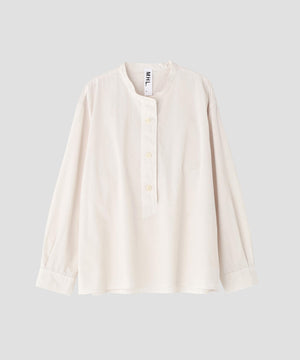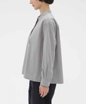三角マチや前後差をつけた着丈を取り入れたスウィングシャツをベースに、Aラインのリラックスフィットへ仕上げたデザイン。フロントの3つボタンと、前開き止まりに入るスラントカットがさりげないアクセント。