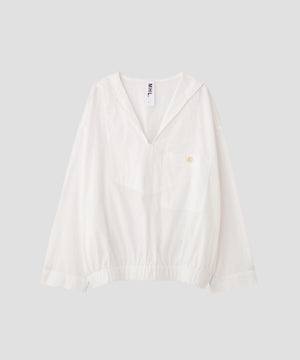 ヴィンテージのフレンチネイビーセーラーシャツから着想を得たデザイン。大きな見返しと胸ポケットが印象的なディテール。ゆったりとした身幅に対し、裾はゴムギャザーで軽く絞り、ほどよいボリューム感。袖は筒袖仕様で、ロールアップしやすく、ラフに着こなせるバランス。