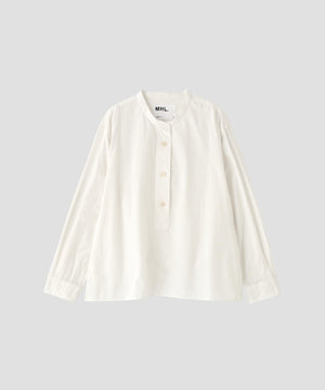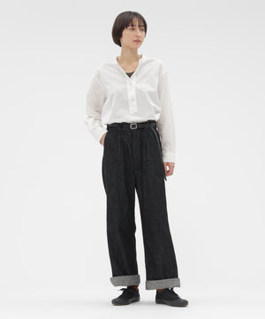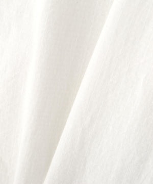 三角マチや前後差のある着丈を取り入れたスウィングシャツをベースに、Aラインのリラックスフィットで構成。フロントの3つボタンと、前開き止まりに配したスラントカットが、さりげないポイント。