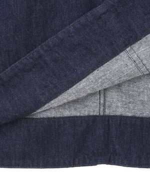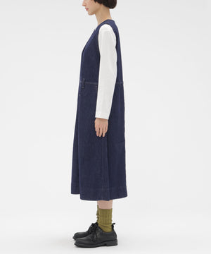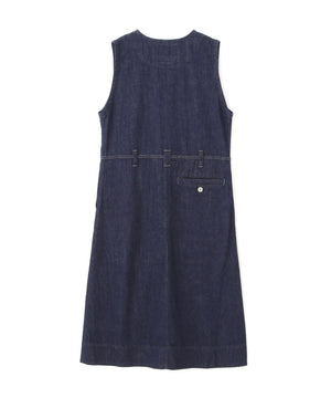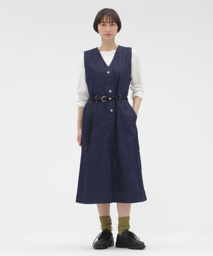 CANTON OVERALLS FOR MHL. のデニムドレス。旧式の紡績機による不均一なネップ感を再現した、CANTONオリジナルのライトオンスデニム素材(9oz)。履き込むほどに現れるタテ落ちと、さりげないネップが重なり、ワークウエアらしい粗野さとヴィンテージ感をあわせ持つ表情。薄手ながら膨らみとコシを備え、扱いやすく耐久性のある仕上がり。