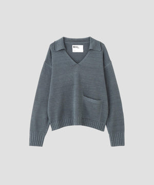 スキッパーデザインを採用した襟付きニット。一重で編み立てた襟がラフな抜け感を添え、シンプルながら印象に残る表情。素材の風合いと相まった、ヴィンテージニットのような雰囲気の一枚。