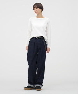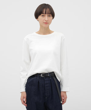 タテに走る編み目と程よいムラ感がヴィンテージのカットソーを思わせる風合いで、幅広いスタイリングに馴染むシンプルなデザイン。