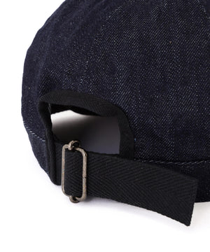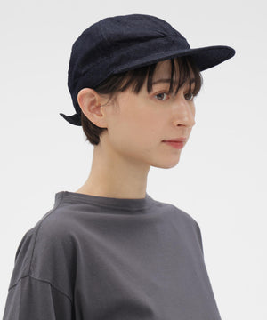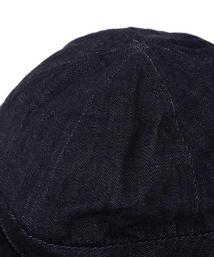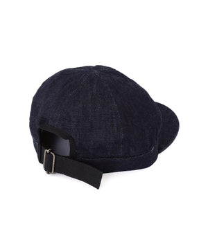 CANTON OVERALLS FOR MHL. のデニムキャップ。旧式の紡績機による不均一なネップ感を再現した、CANTONオリジナルのライトオンスデニム素材(9oz)。履き込むほどに現れるタテ落ちと、さりげないネップが重なり、ワークウエアらしい粗野さとヴィンテージ感をあわせ持つ表情。薄手ながら膨らみとコシを備え、扱いやすく耐久性のある仕上がり。