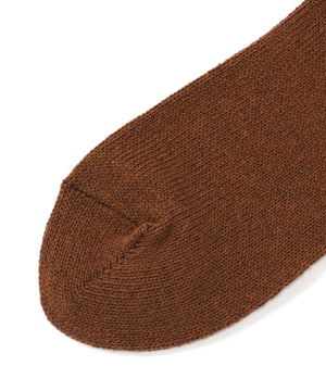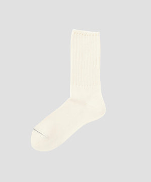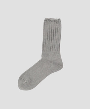 和紙とコットンを撚り合わせた糸を用いた、吸水性と放湿性に優れたリブソックス。清潔感のあるドライな質感に、染まり方の違いから生まれる奥行きのあるメランジカラーがさりげないポイント。履き口のリブとボディの天竺編みのコントラストも、表情に変化を添えるディテール。