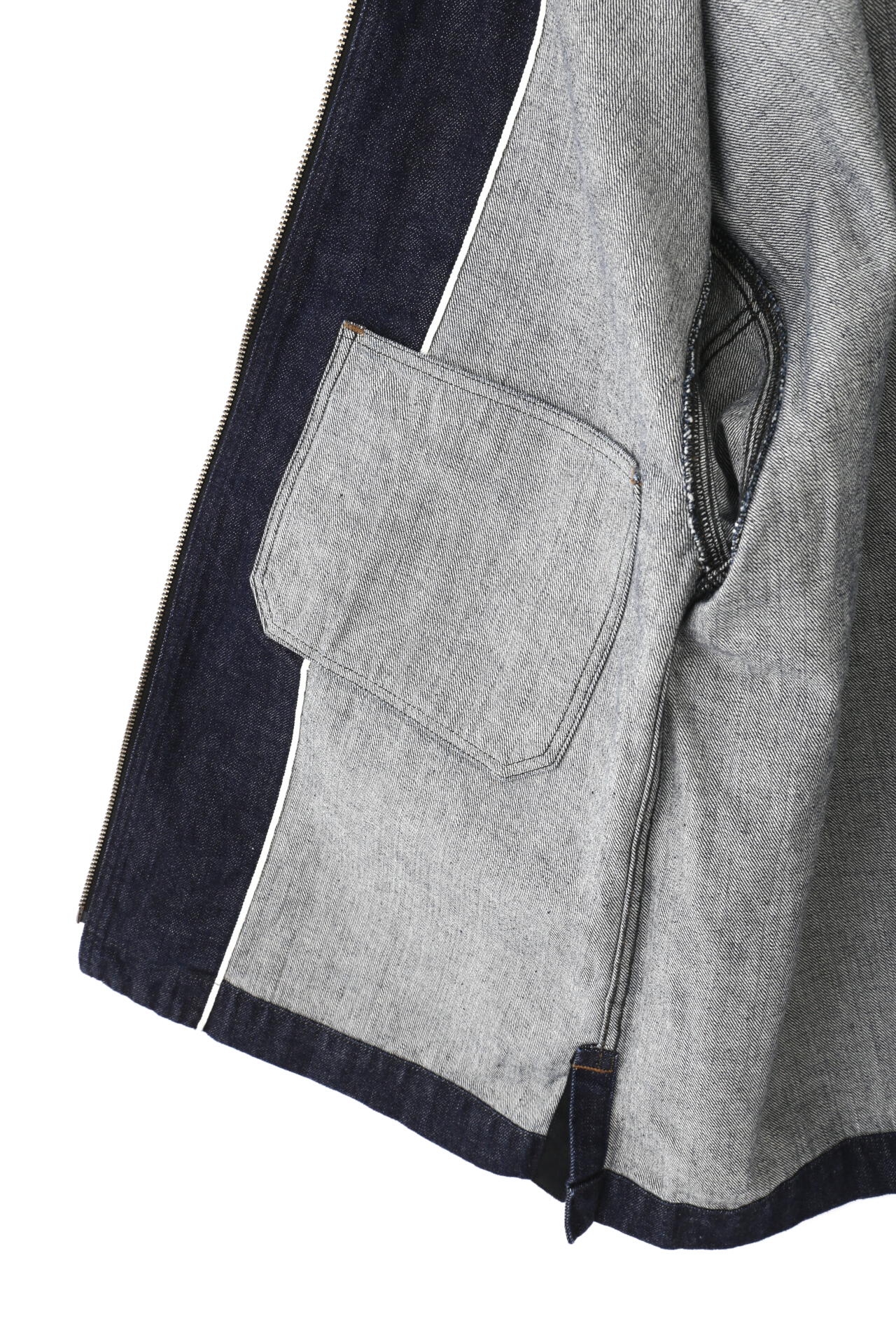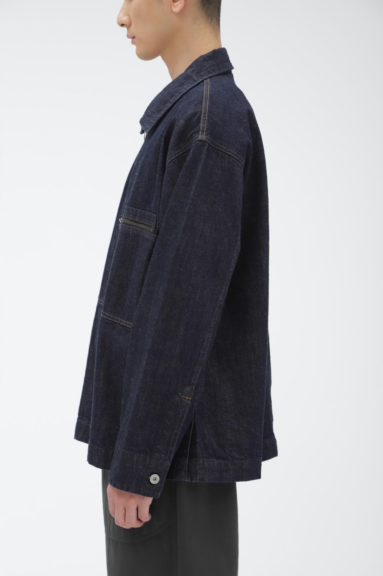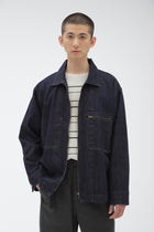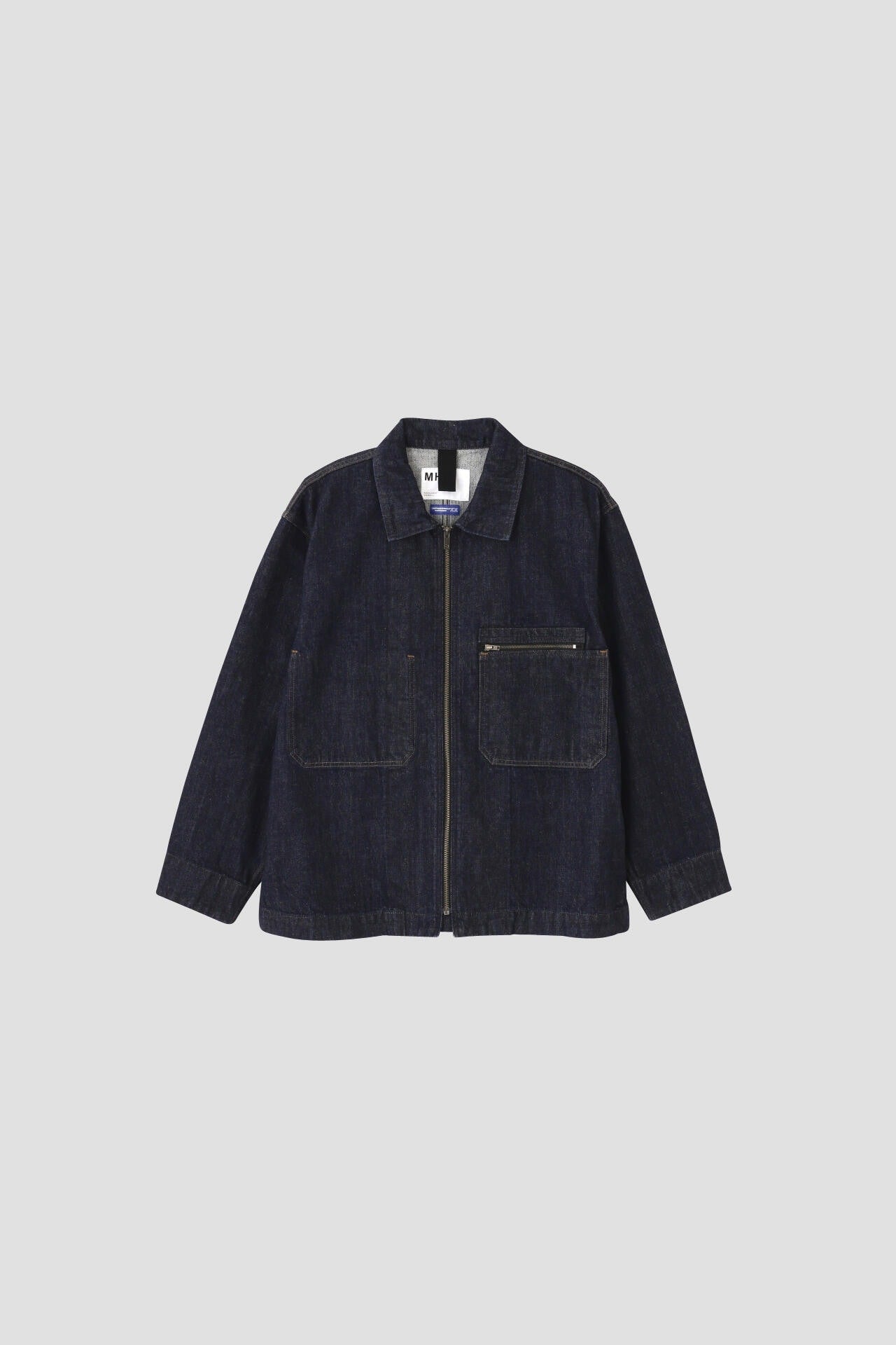 MHL.らしいタフなディテールを採用したデニムジャケット。ジップの開閉部分とペン差しが一体となった胸ポケットなど、キャラクターと機能性を備える。