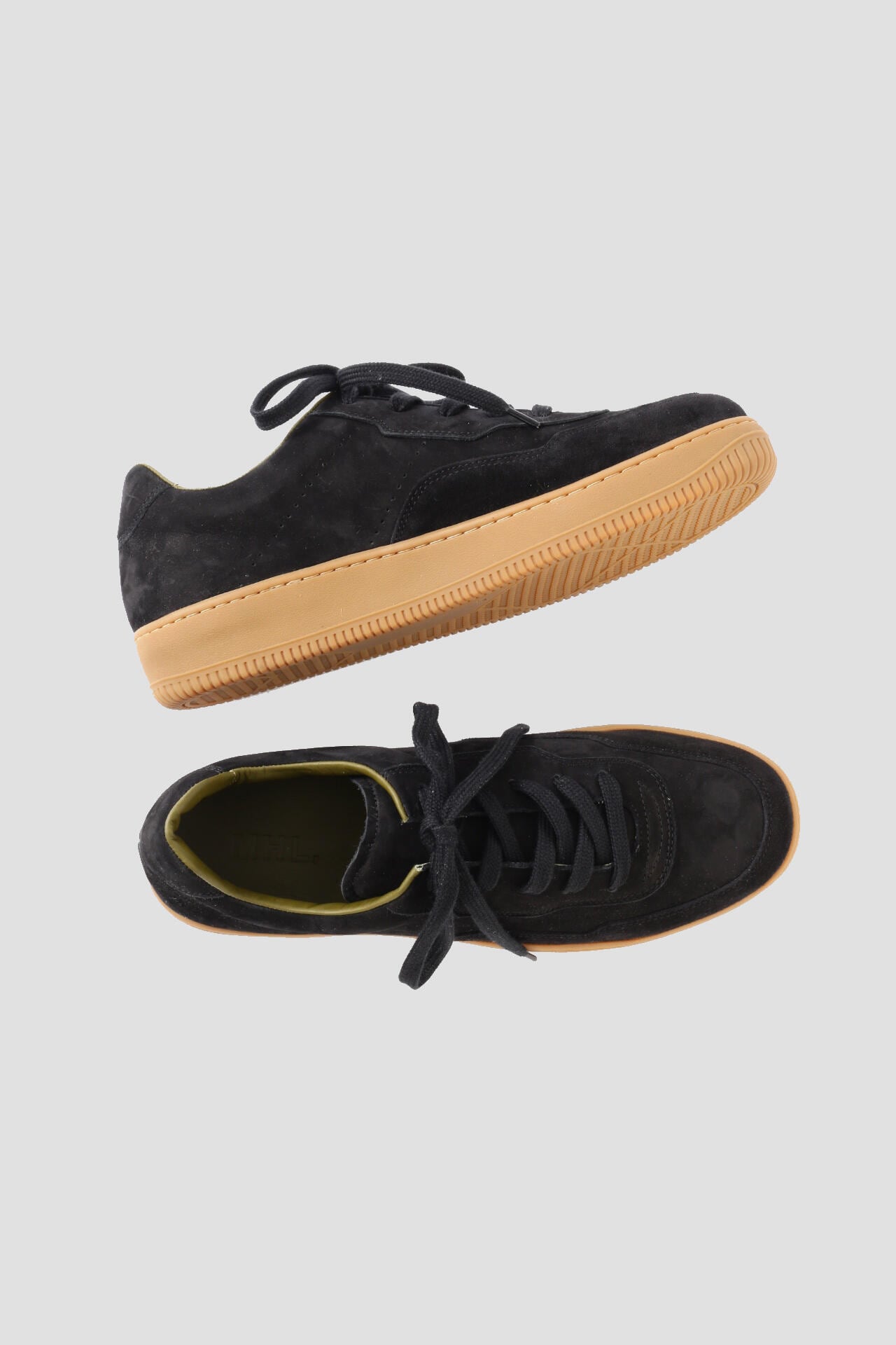 ブラックカラーを採用したスウェード素材のシューズ。フロントパネルのディテールと重厚なガムソールとのコントラストが特徴。
