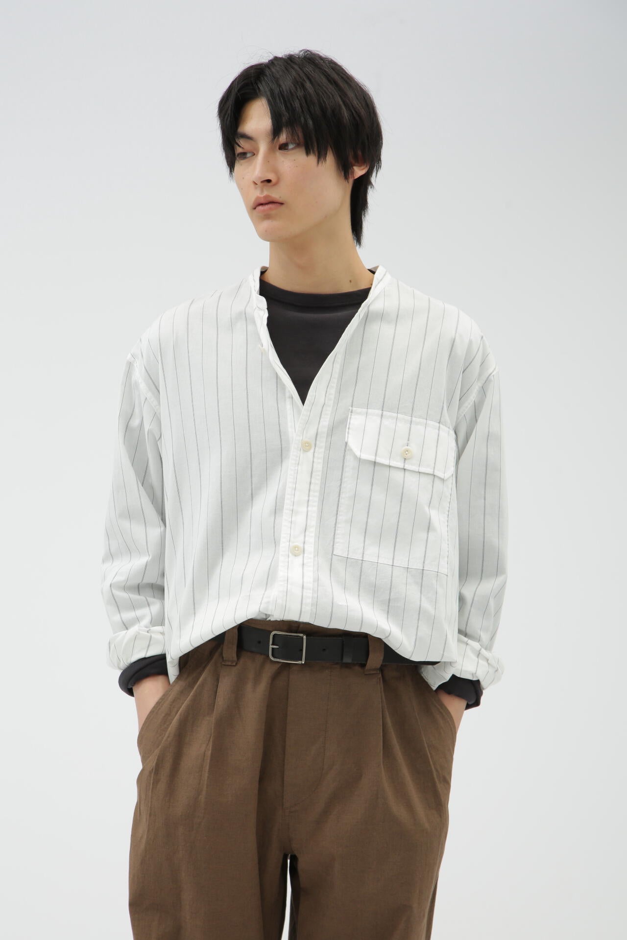 タテ糸にムラの少ない糸、ヨコ糸にスラブ感のあるコットン糸を使用したストライプ素材のシャツ。異なる質感の糸を組み合わせることで、カジュアルすぎず上品な風合いが特徴。製品洗いを施し、柔らかさと適度なハリを持たせた生地感。ヴィンテージのプルオーバーシャツをベースに、フルオープン仕様にアレンジ。バックヨークのボックスステッチや2枚袖など、ブランドらしいディテールを採用。ラウンドした裾が動きを生み、さまざまなスタイルに取り入れやすいデザイン。