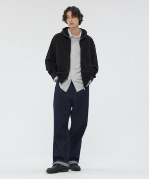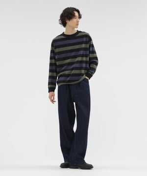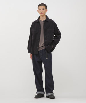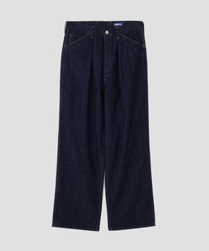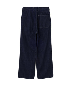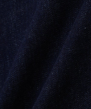 テキサス産オーガニックコットンを使用した、13.75オンスのデニムトラウザーズ。一般的なデニムよりも軽く柔らかな着心地で、着用を重ねることで繊細なタテ落ちが生まれる奥行きのある表情。混じり気のないインディゴブルーと、グレーステッチが特徴。
