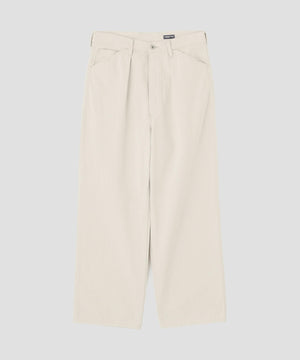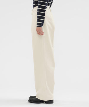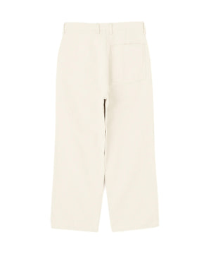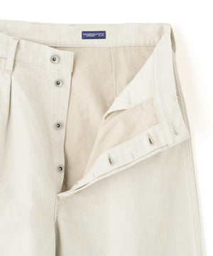 ヴィンテージのミリタリーパンツから着想を得た、中心寄りの2本タックが目を引くデザイン。腰まわりに適度なゆとりを持たせ、裾に向かってテーパードするラインがポイント。細幅の三つ折り仕上げや片側のみのヒップポケットなど、さりげない抜け感を加えた一本。